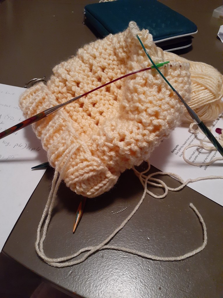 Begin the decreasing/shaping of the crown of the hat. I started using 2 circulars at this point, but if you prefer, then you can use one longer cable for the whole process and knit using the magic loop technique. My 16″ cable is too small to use for magic loop. So, I opted for 2 sets of needles. Keep a stitch marker in place to identify the beginning of the work.