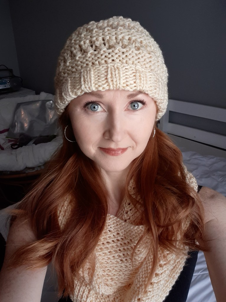 After knitting the Autopilot Cowl, I needed a hat to match. I wanted the hat to be warm and incorporate some of the eyelet appearance into the design. I used two strands of yarn to create bulk and that extra warmth. My pattern is very simple and can be adapted for a different number of stitches based on what you want the circumference of your hat to be. I used Knit Picks Caspian Interchangeable 6.5mm, 16″ circular needles and Knit Picks Brava Worsted yarn (weight 4) in Cream.