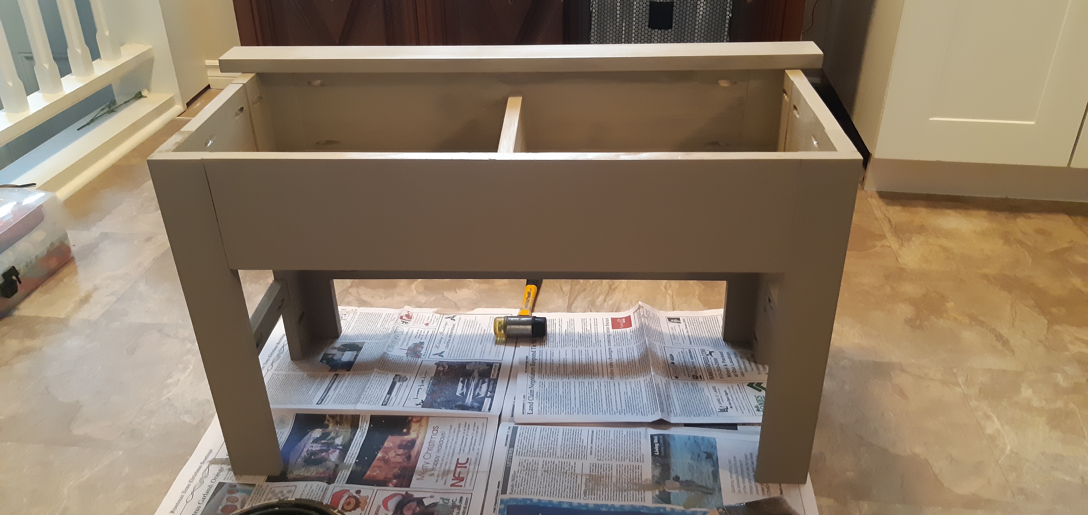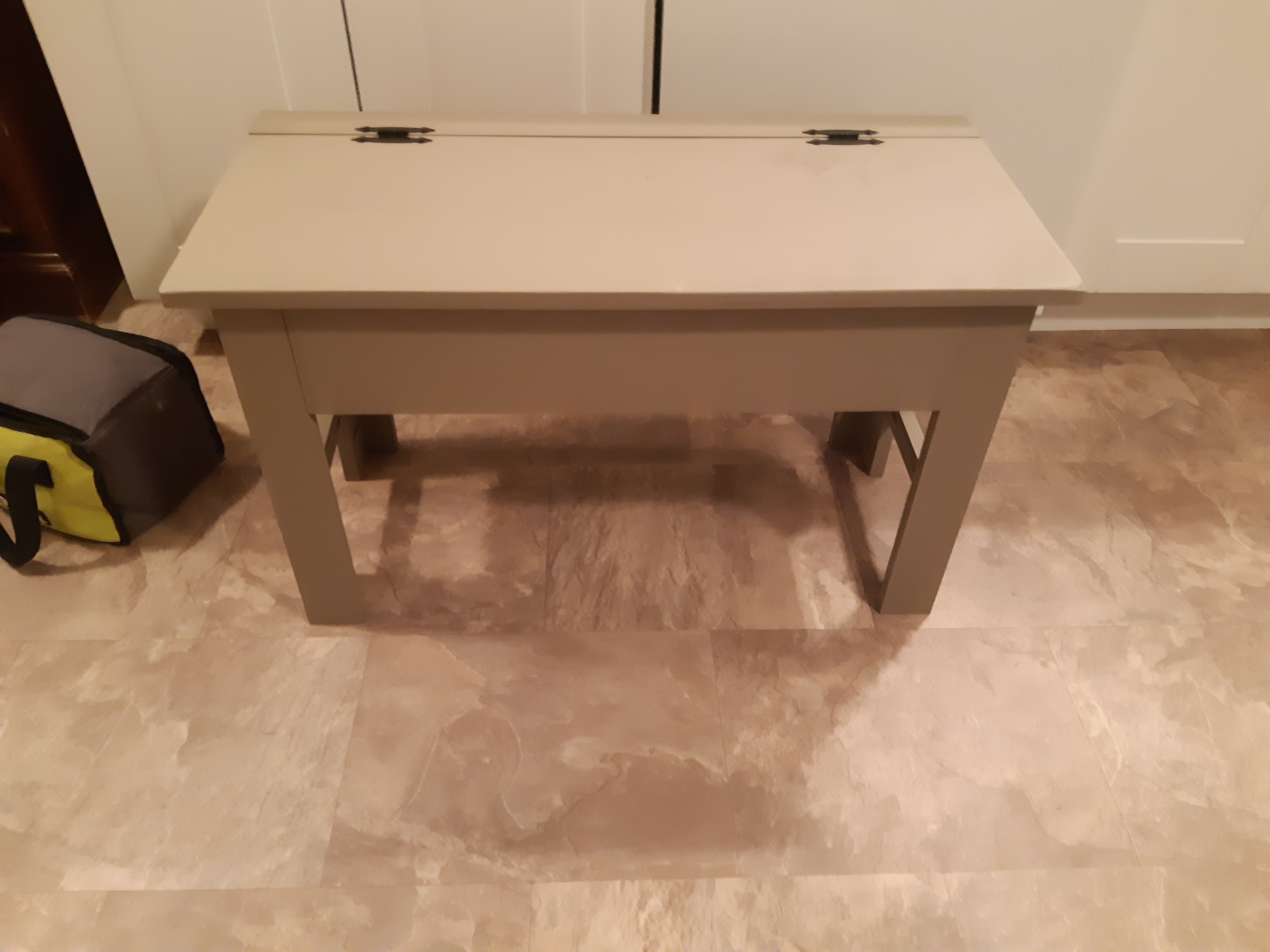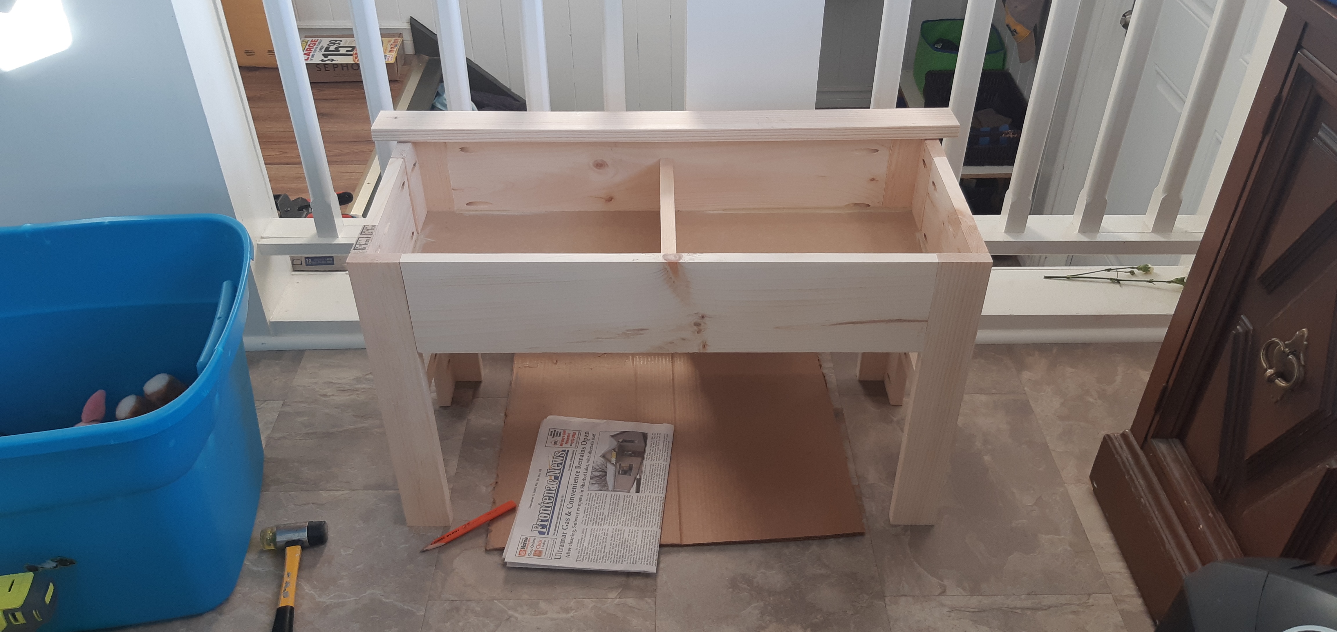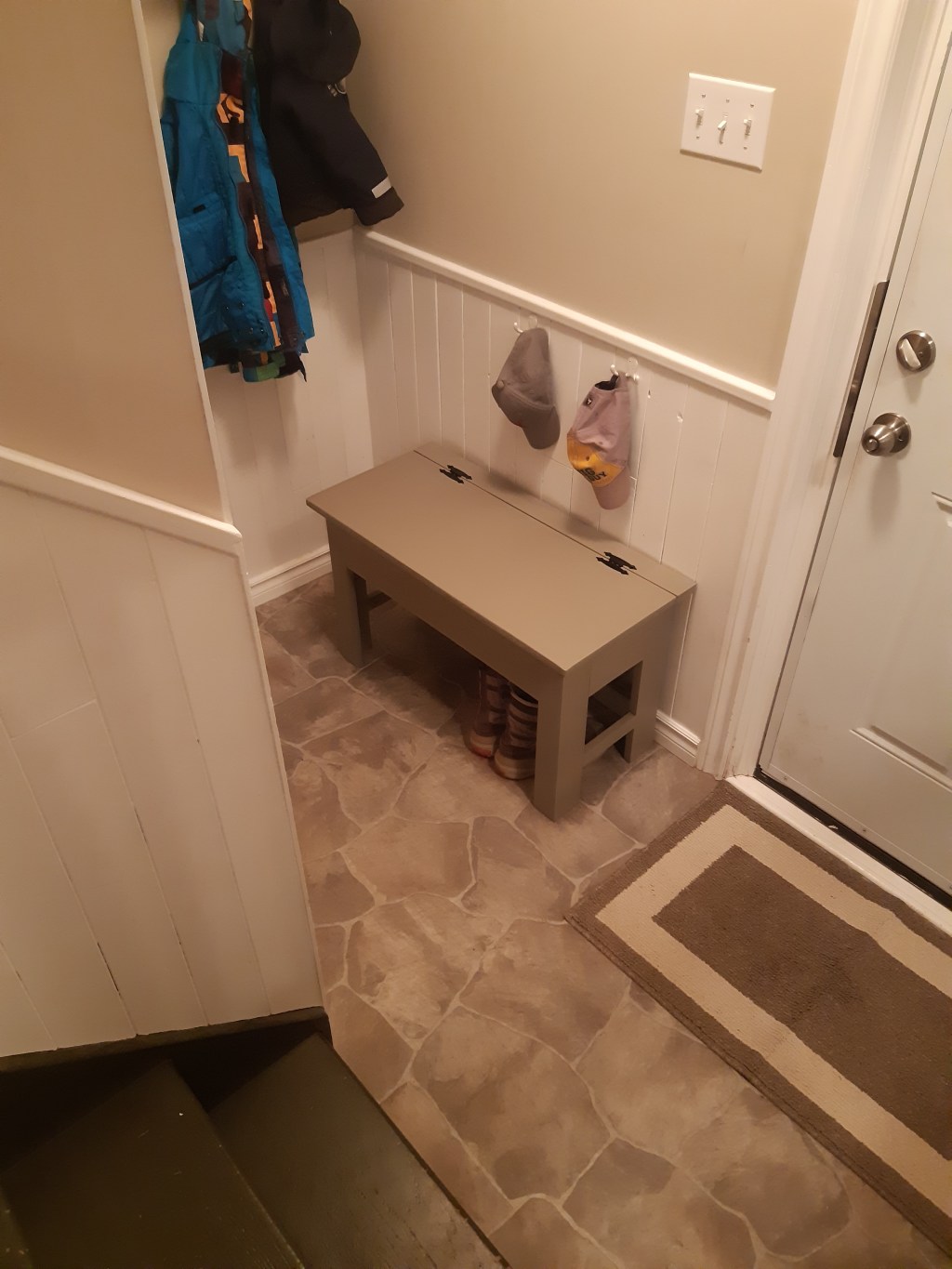 This project went together very nicely and gave my tiny foyer a much needed improvement through increased storage. I have four children and that means that I have way too many hats and mitts. This bench was one of three things that I built to improve the function of my foyer. I designed the bench with a storage box frame built out of 1x6s, with a 1×4 divider to organize the interior for my two youngest children. The lid would not be difficult nor dangerous for them to lift and access their hats and accessories. The box frame base is mdf. I based all measurements to incorporate the 16″ bare mdf shelving board. It was very simple. I made the legs out of 1x3s and 1x4s, with a 1×2 frame brace on the sides and back. The front was left open so that we could use that space to store boots easily. The front back piece is a simple 1×4 that gives good structure to attach hinges for the bench seat/lid which is 3/4″ plywood. The main bench construction used Kreg pockethole joinery as well as a nail gun. The neutral colour and vintage hinges gave the bench a very country classical appearance.