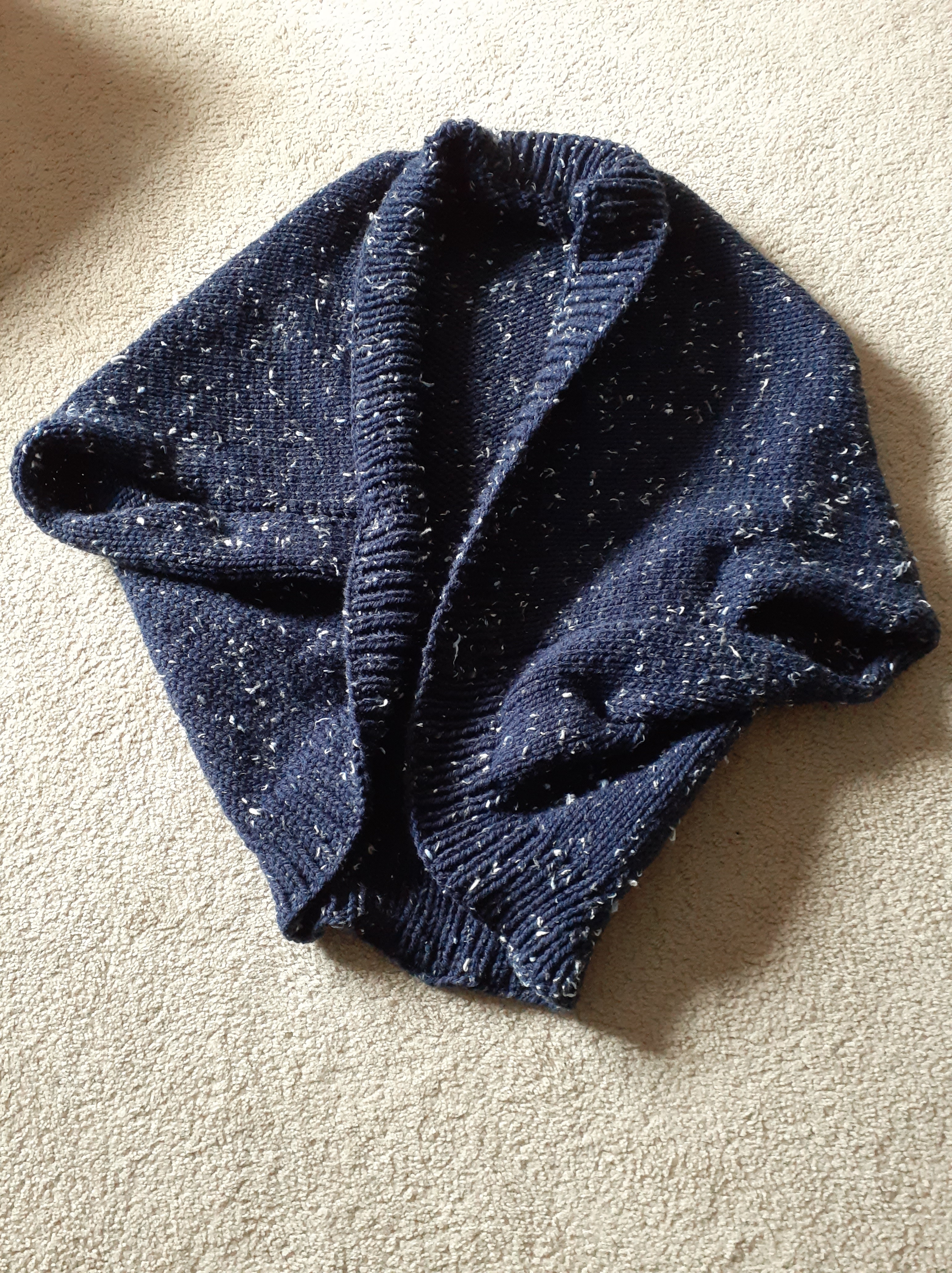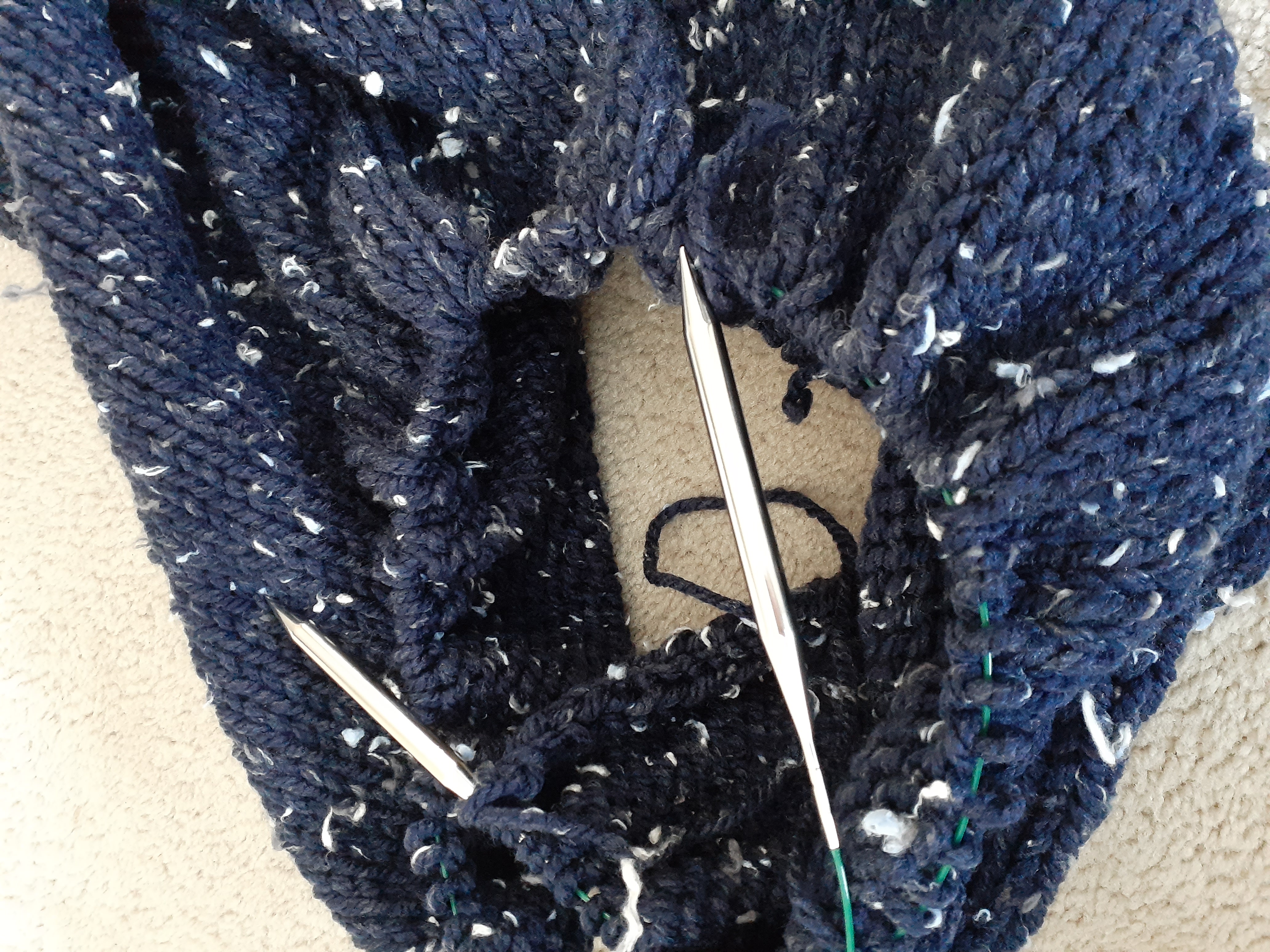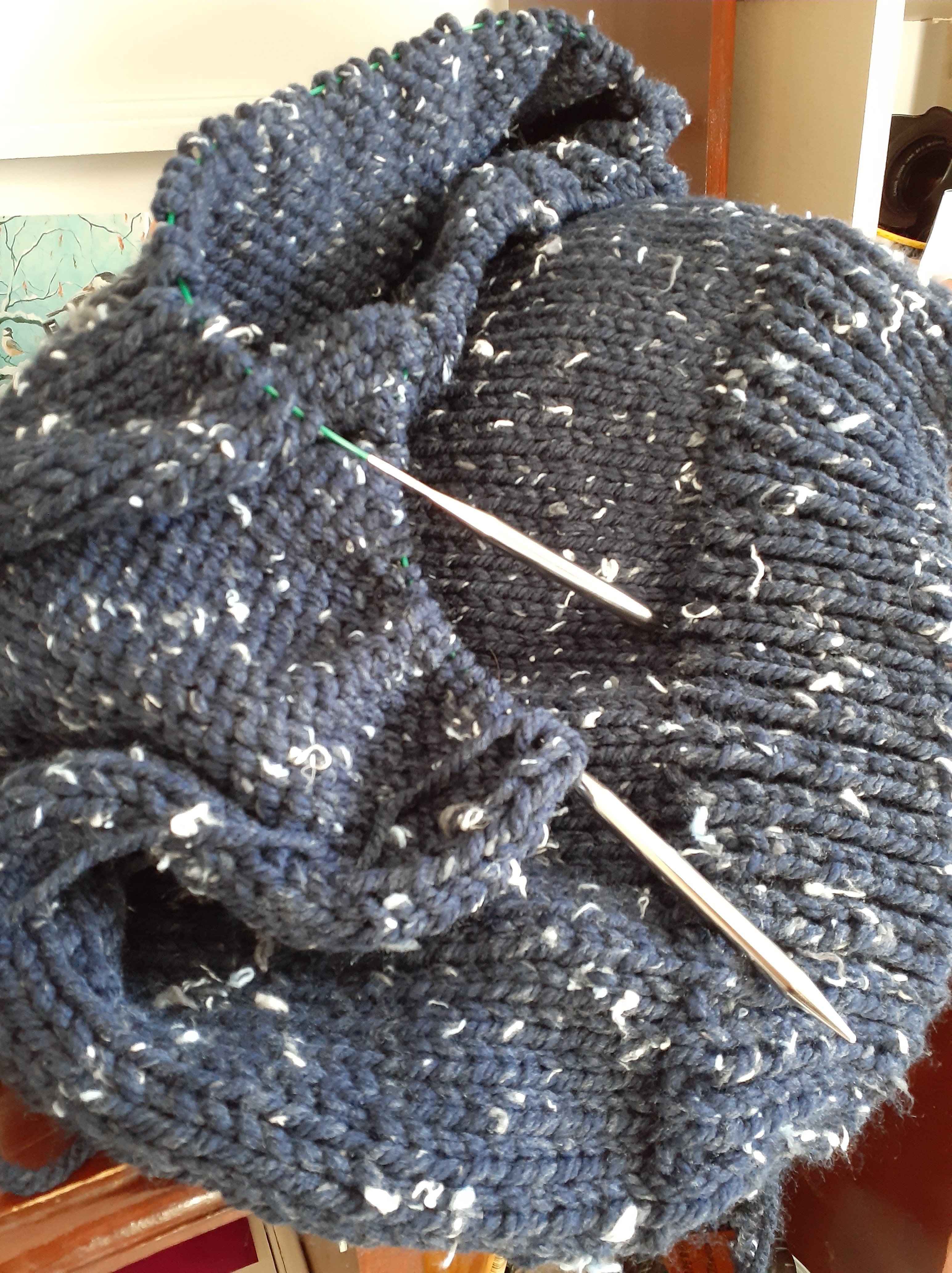 I was looking for a really warm sweater pattern that I could knit for our very chilly Ontario winters. I liked the simplicity of the Lion Brand Fishermen’s Wool Speckled Shrug, which is a free pattern available to download. I am using Bernat Softee Chunky in a denim blue tweed and Knit Picks 40″ 9mm (US13) interchangeable circular needles. This shrug knits up really quickly because of the bulky yarn and large needles. It’s a nice break from tiny sock stitches.