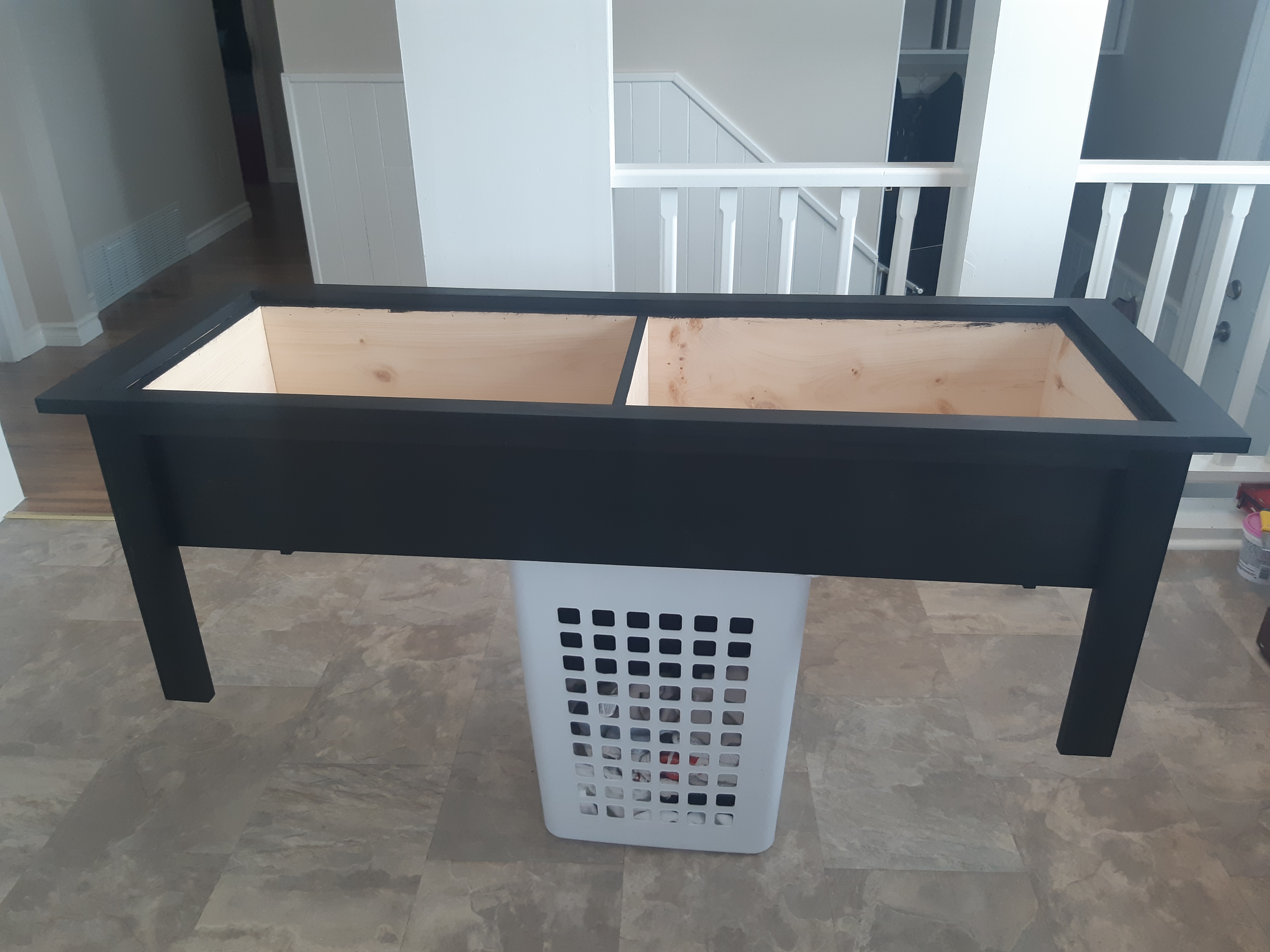 Paint or stain (I used black paint by Rustoleum for the outside [https://www.homedepot.ca/product/rust-oleum-painter-s-touch-multi-purpose-paint-in-semi-gloss-black-946-ml/1000140786], and a grey Varathane stain for the inside [https://www.homedepot.ca/product/varathane-ultimate-oil-based-interior-wood-stain-in-carbon-grey-236-ml/1001048595?rrec=true] and lined it with shelf paper)