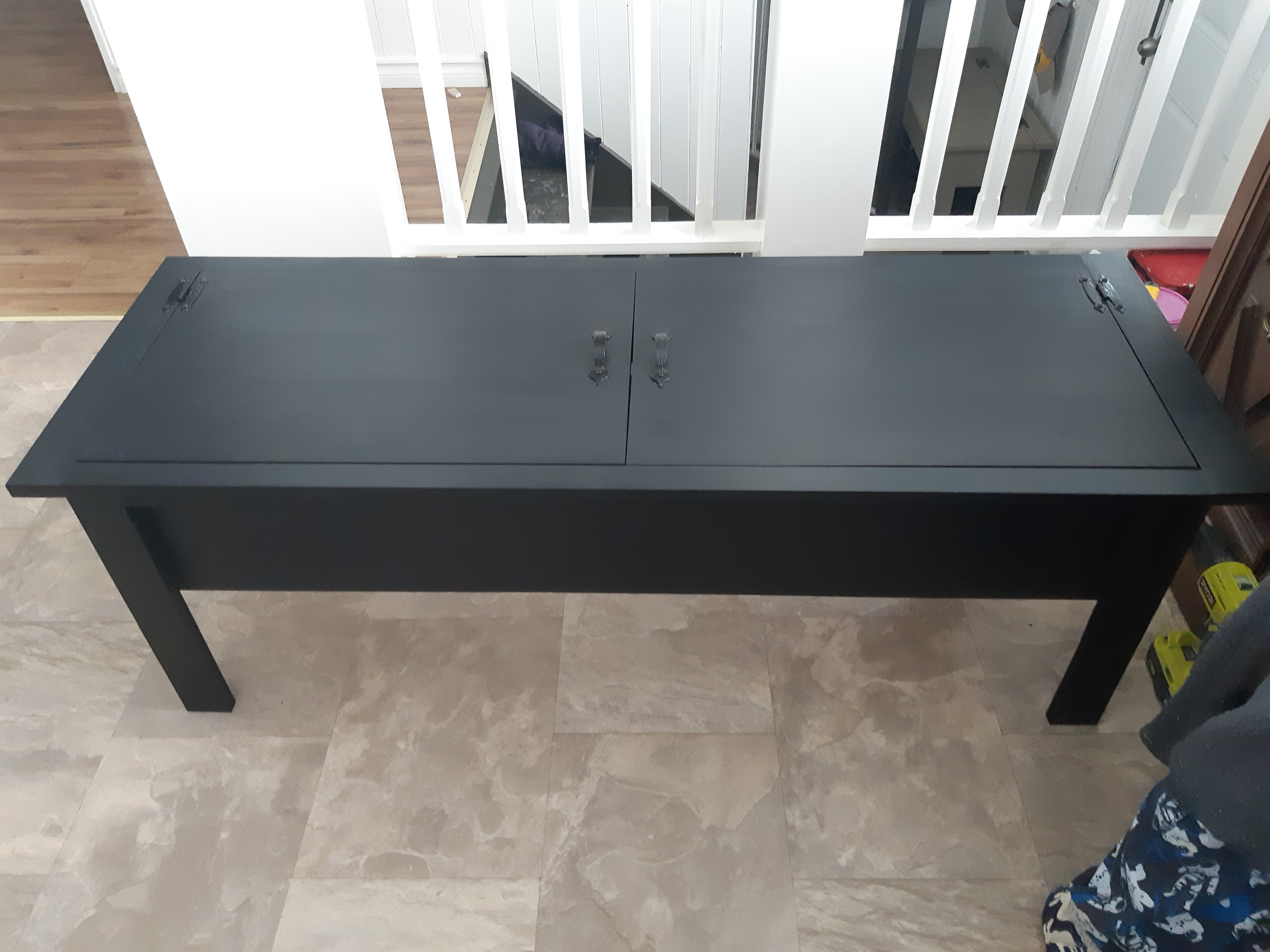 I love my table! I chose vintage handles and hinges. The hinges match those that I put on my foyer storage bench. I like the hammered metal look. The coffee table was almost fully assembled using glue and my highly favoured Ryobi Air Strike nail gun. It only took me three days to build and finish painting. This a super easy and fun weekend project. You won’t regret adding a storage table to a living room.
