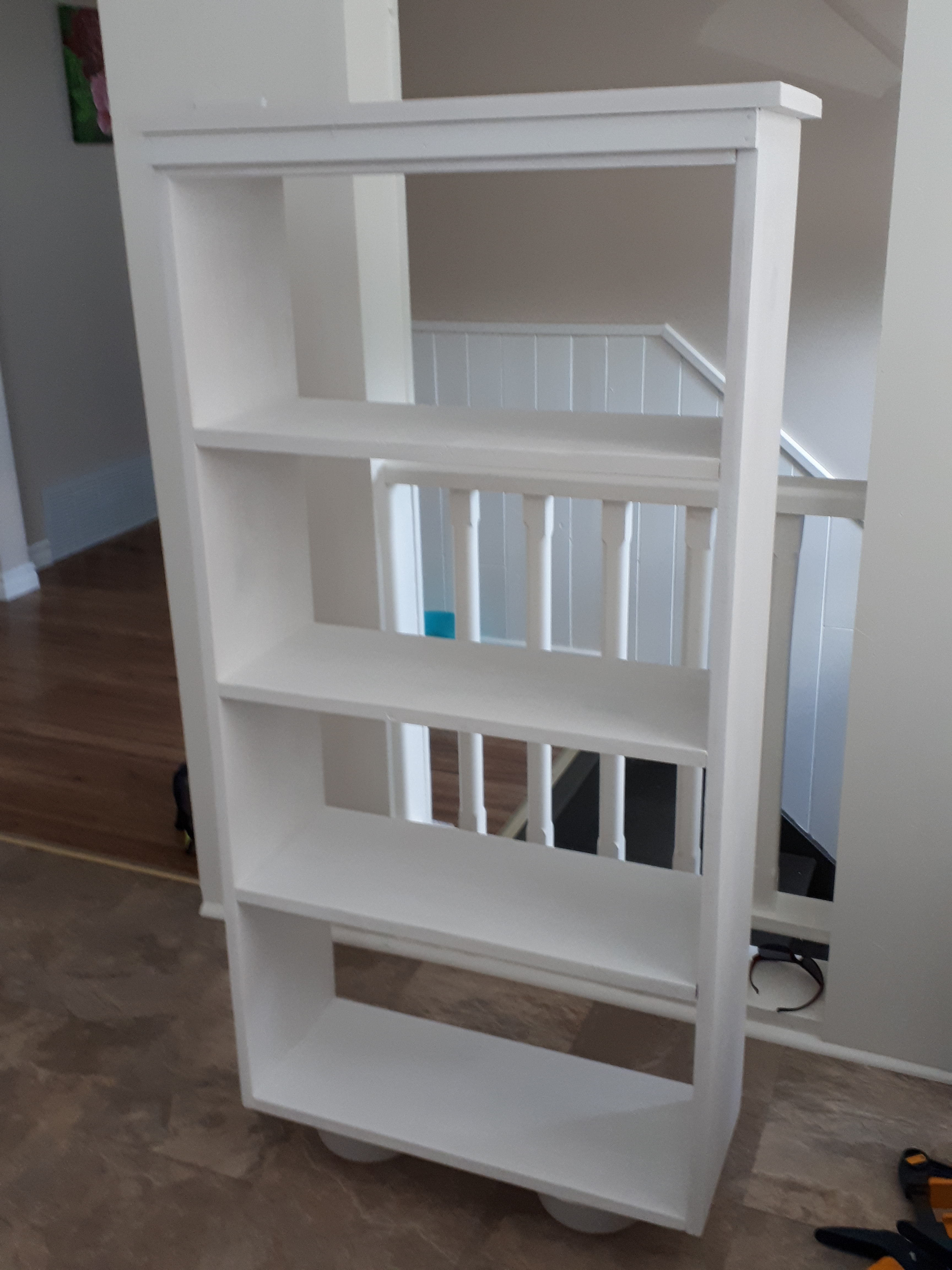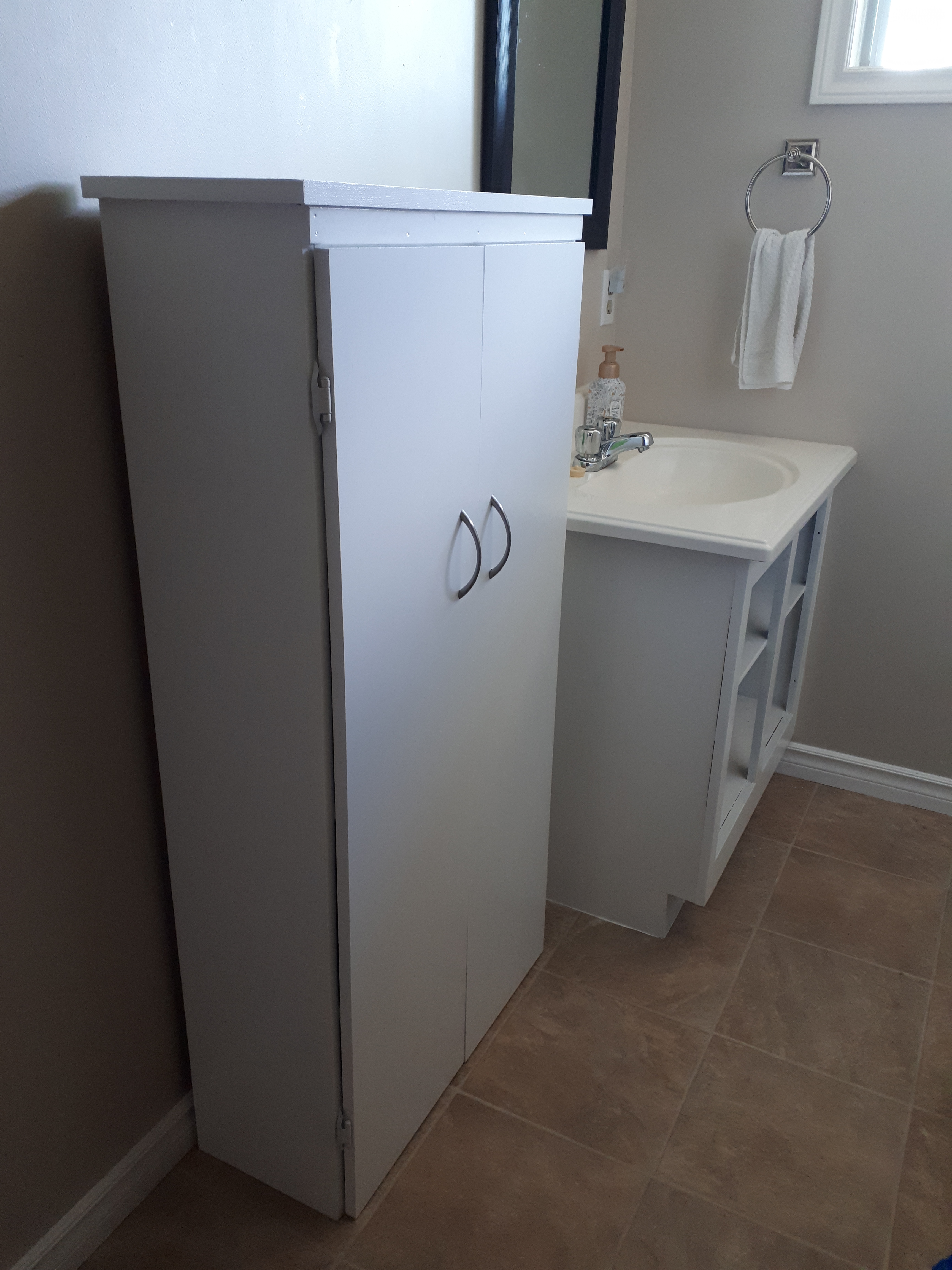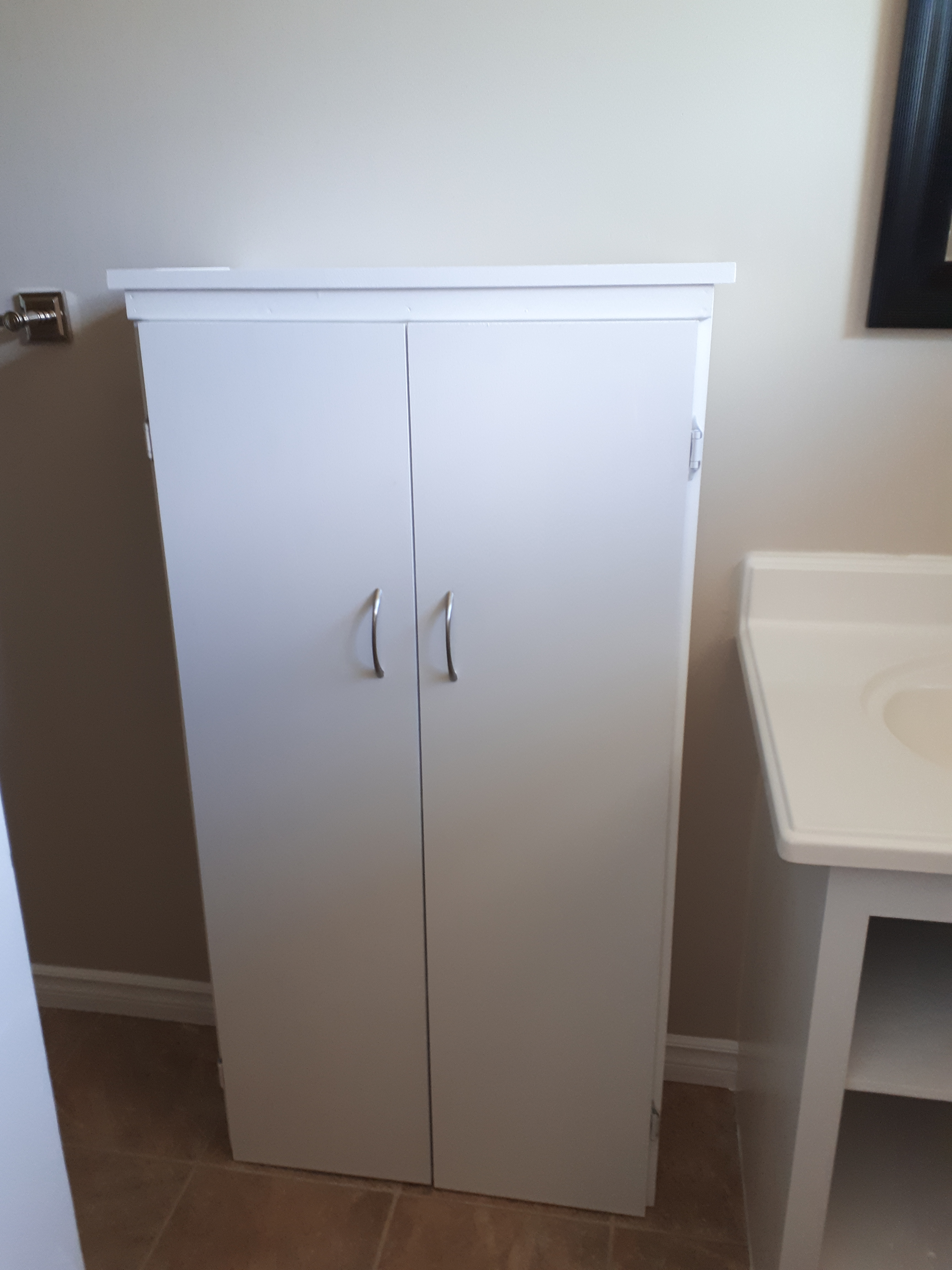 Storage is always important no matter what room you are in. Bathrooms often seem especially cluttered under the sink. With 4 kids and only 1 full bathroom, a new cabinet was necessary. This was a simple build. I based the width on the 12″ mdf unfinished shelving that I was planning to use for the 2 doors. I had hinges that would allow a 1/2″ overhang, so that made it roughly 25″ wide. The cabinet went together pretty quickly. I used pocket holes for the box and shelves. The trim was just glued and nailed on (didn’t have my nail gun when I made this guy), but added a nice finishing touch. The cabinet has made a big difference in the main bathroom. I love when something so simple to build can look so classy country. I personally love white paint because it is clean looking and hides my imperfections. My Home Depot had a decent selection of 4′ long 1″x10″ pine boards when I made this cabinet about 2 years ago. They sand up well and finish very nicely, but are not so readily available in 2022. I also updated the hinges on the vanity doors, added a shelf to the vanity for even more organizational opportunities, and repainted the vanity so that the white paint would match on the side-by-side cabinets. The cabinet has a 1×2 brace piece on the 2nd shelf so that it can stay safely attached to the wall. No safety hazards, please. This was one my first larger furniture pieces and I have learned a lot since I made it, but it is still one of my favourite beginner projects.