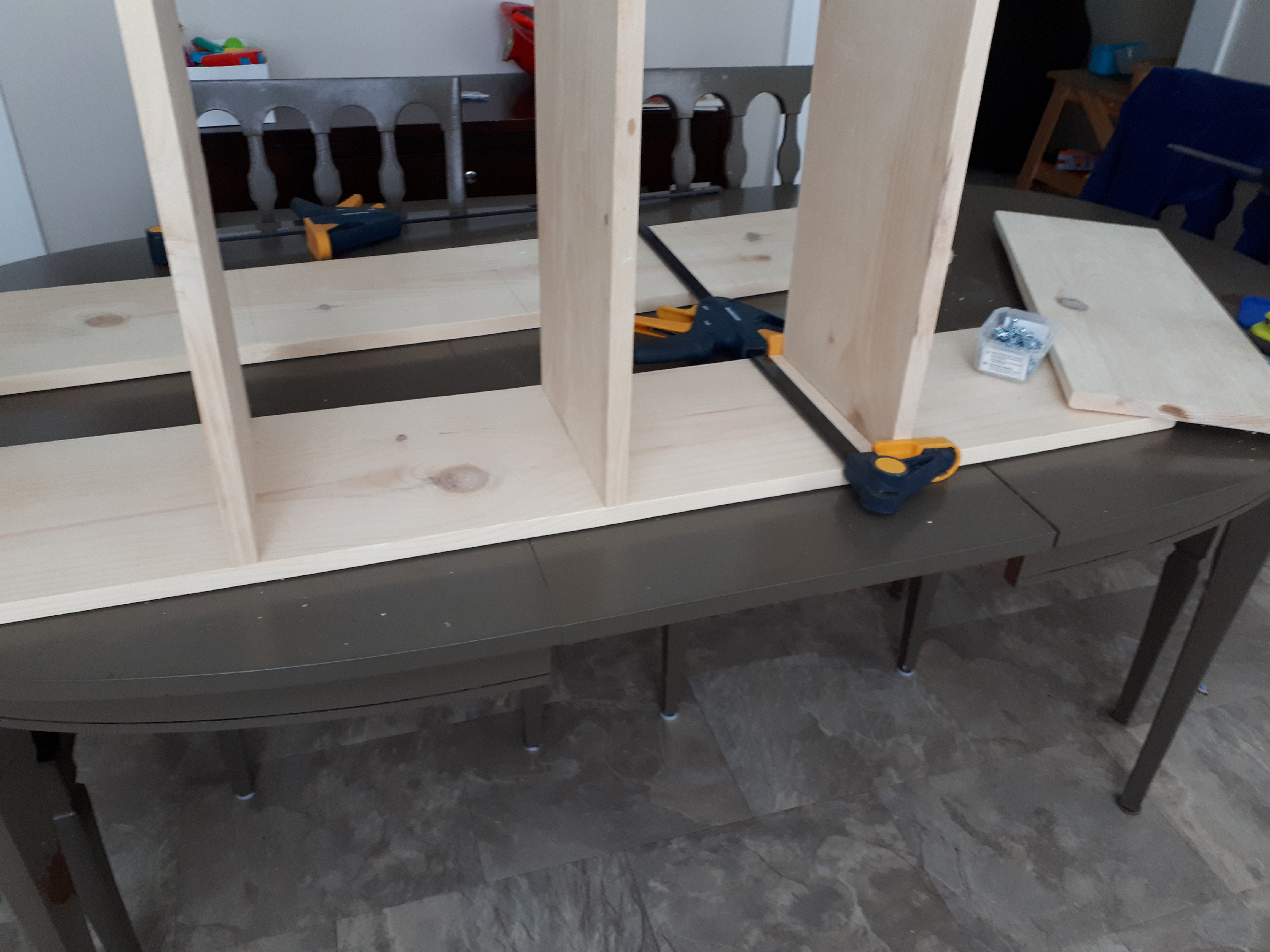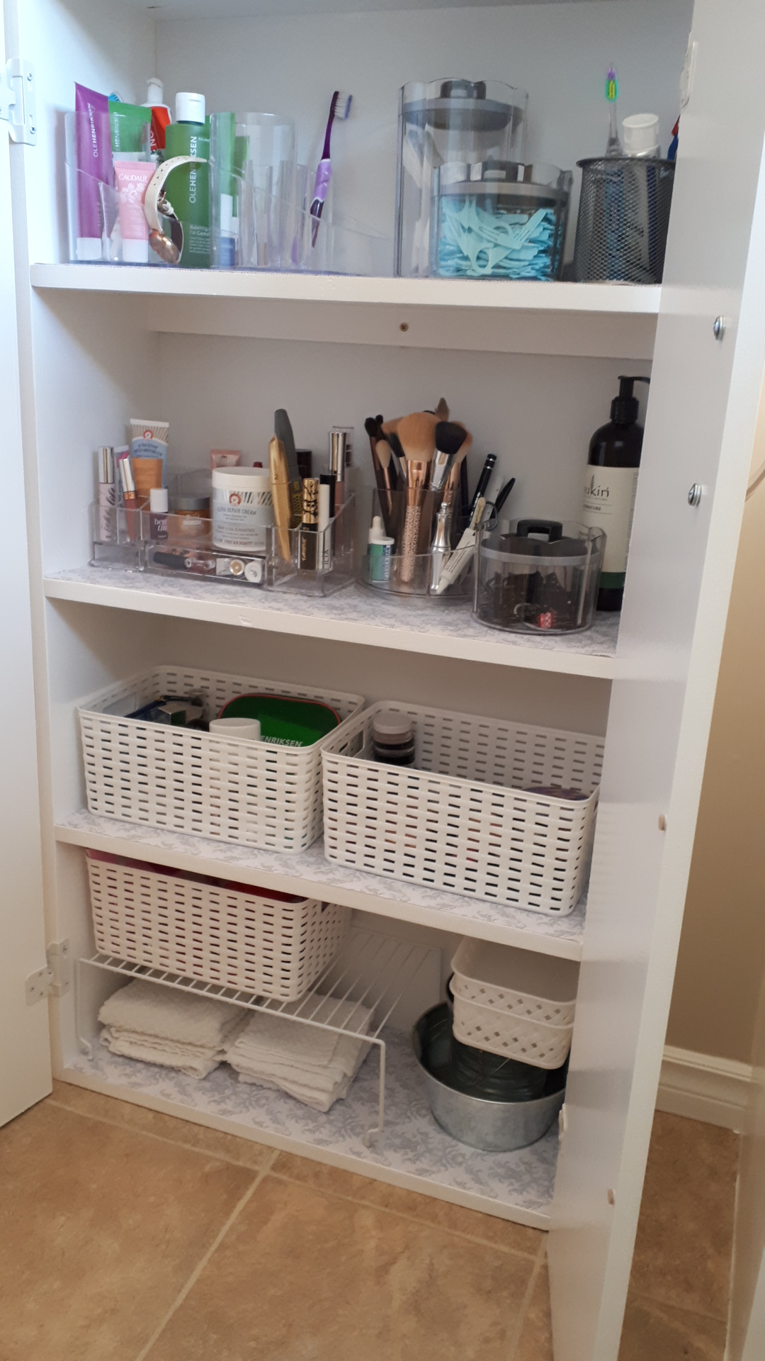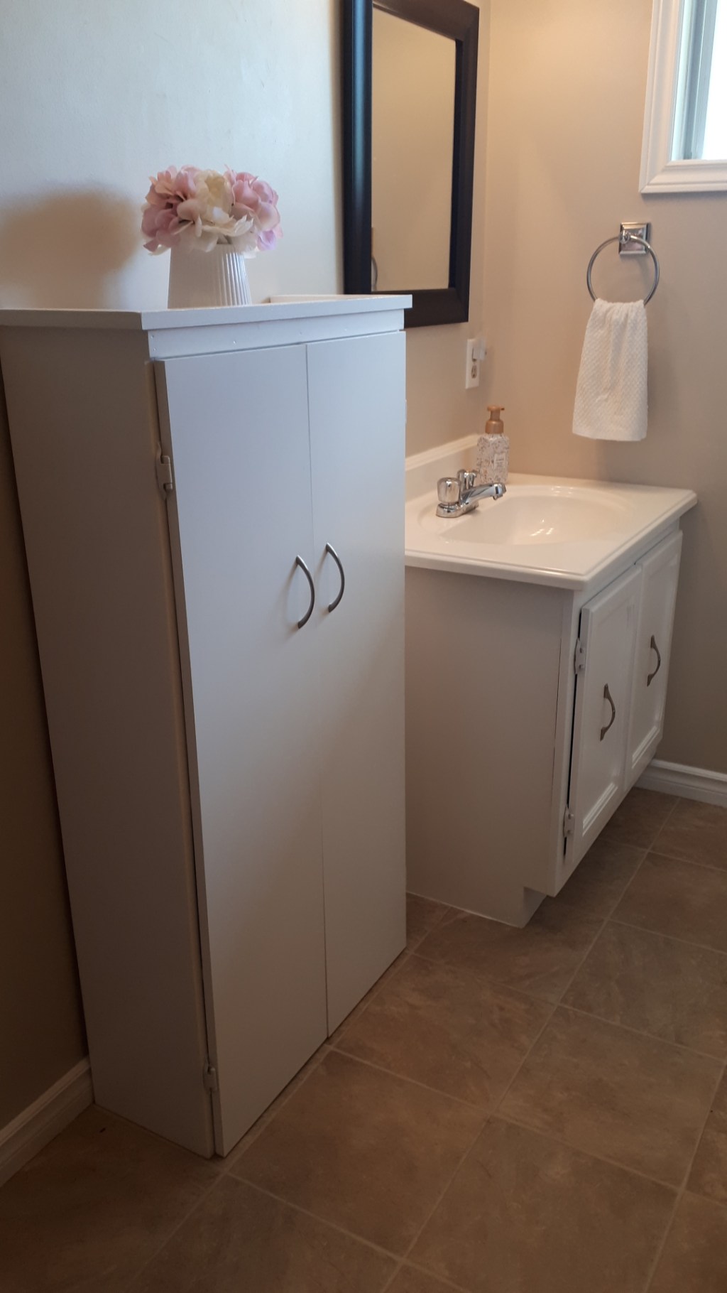 Storage is always important no matter what room you are in. Bathrooms often seem especially cluttered under the sink. With 4 kids and only 1 full bathroom, a new cabinet was necessary. This was a simple build. I based the width on the 12″ mdf unfinished shelving that I was planning to use for the 2 doors. I had hinges that would allow a 1/2″ overhang, so that made it roughly 25″ wide. The cabinet went together pretty quickly. I used pocket holes for the box and shelves. The trim was just glued and nailed on (didn’t have my nail gun when I made this guy), but added a nice finishing touch. The cabinet has made a big difference in the main bathroom. I love when something so simple to build can look so classy country. I personally love white paint because it is clean looking and hides my imperfections. My Home Depot had a decent selection of 4′ long 1″x10″ pine boards when I made this cabinet about 2 years ago. They sand up well and finish very nicely, but are not so readily available in 2022. I also updated the hinges on the vanity doors, added a shelf to the vanity for even more organizational opportunities, and repainted the vanity so that the white paint would match on the side-by-side cabinets. The cabinet has a 1×2 brace piece on the 2nd shelf so that it can stay safely attached to the wall. No safety hazards, please. This was one my first larger furniture pieces and I have learned a lot since I made it, but it is still one of my favourite beginner projects.